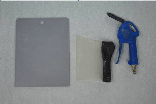 原子灰刮涂工藝中要使用調灰板、刮刀、吹塵槍等工具。如圖2-29所示