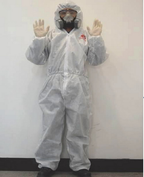 刮涂原子灰過程中,由于有毒溶劑的揮發,為保護施工人員的人身安全,施工人員必須穿噴漆服、護目眼鏡、防毒面罩、無硅乳膠手套、防溶劑手套、工作鞋等。如圖2-30所示