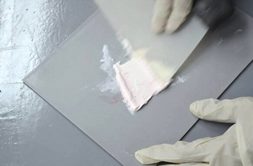 用原子灰刮刀取少量填眼灰置于原子灰托板上,也可以置于另一把刮刀片上。由于填眼灰一般不需要添加固化劑,取出后即可使用(有的填眼灰需按比例加入稀釋劑混合后才能使用),而且其固化時間很短,用量也少,所以應少取,并且應在盡量短的時間內用完。