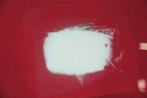 ①砂紙打磨法。在原子灰干燥過程中,可以拿80#的砂紙輕輕地打磨原子灰邊緣薄的部分,檢查原子灰是否已經干透。如果沒有干透,則在砂紙上會粘有原子灰;如果已經干透,則不會粘上原子灰,并在原子灰上出現堅硬的白色痕跡。如圖2-52所示。