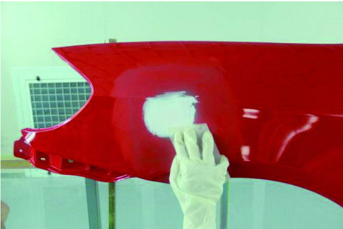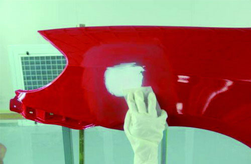 在進行原子灰刮涂之前,應先對已經刷涂好的底漆部分進行必要的打磨及清潔。先使用菜瓜布對底漆部分進行輕微打磨,可以去掉底漆多余的那部分漆粉。再用吹塵槍進行除塵清潔,避免刮涂后的原子灰與底漆結合不牢固。如圖2-31所示。