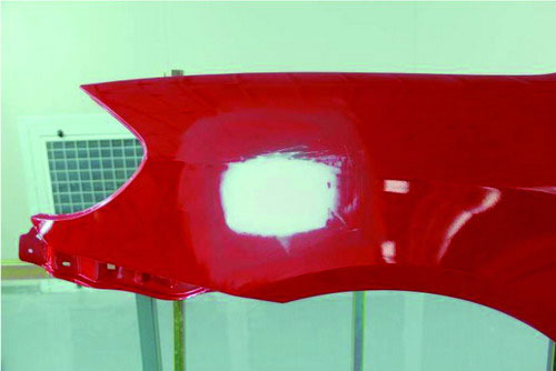 ②指刮法。在原子灰干燥過程中,可以用手指甲輕輕地刮原子灰邊緣薄的部分,檢查原子灰是否已經干透。如果沒有干透,則在指甲上會粘有原子灰;如果已經干透,則指甲不會粘上原子灰,并在原子灰上出現堅硬的白色痕跡。如圖2-53所示。